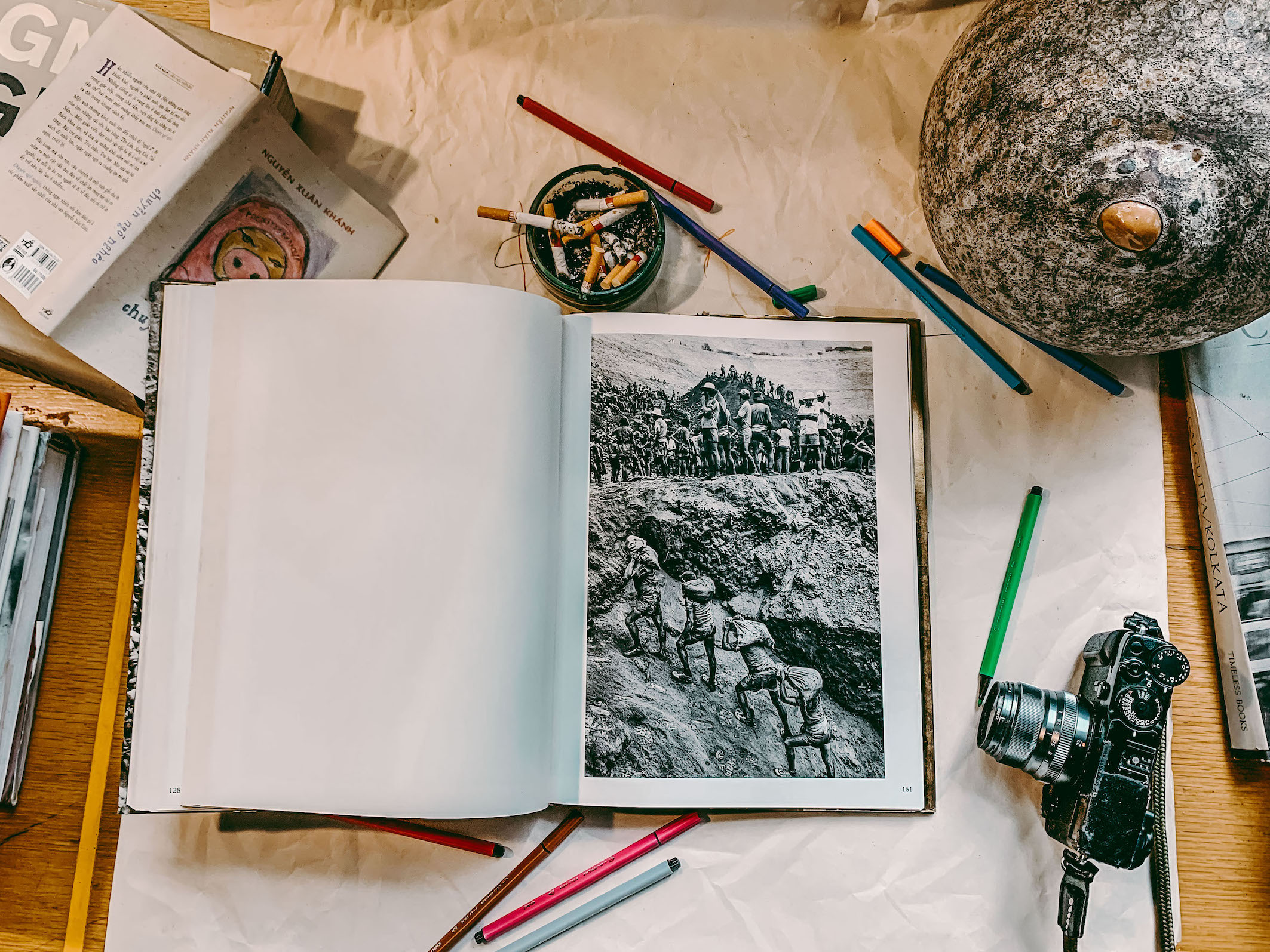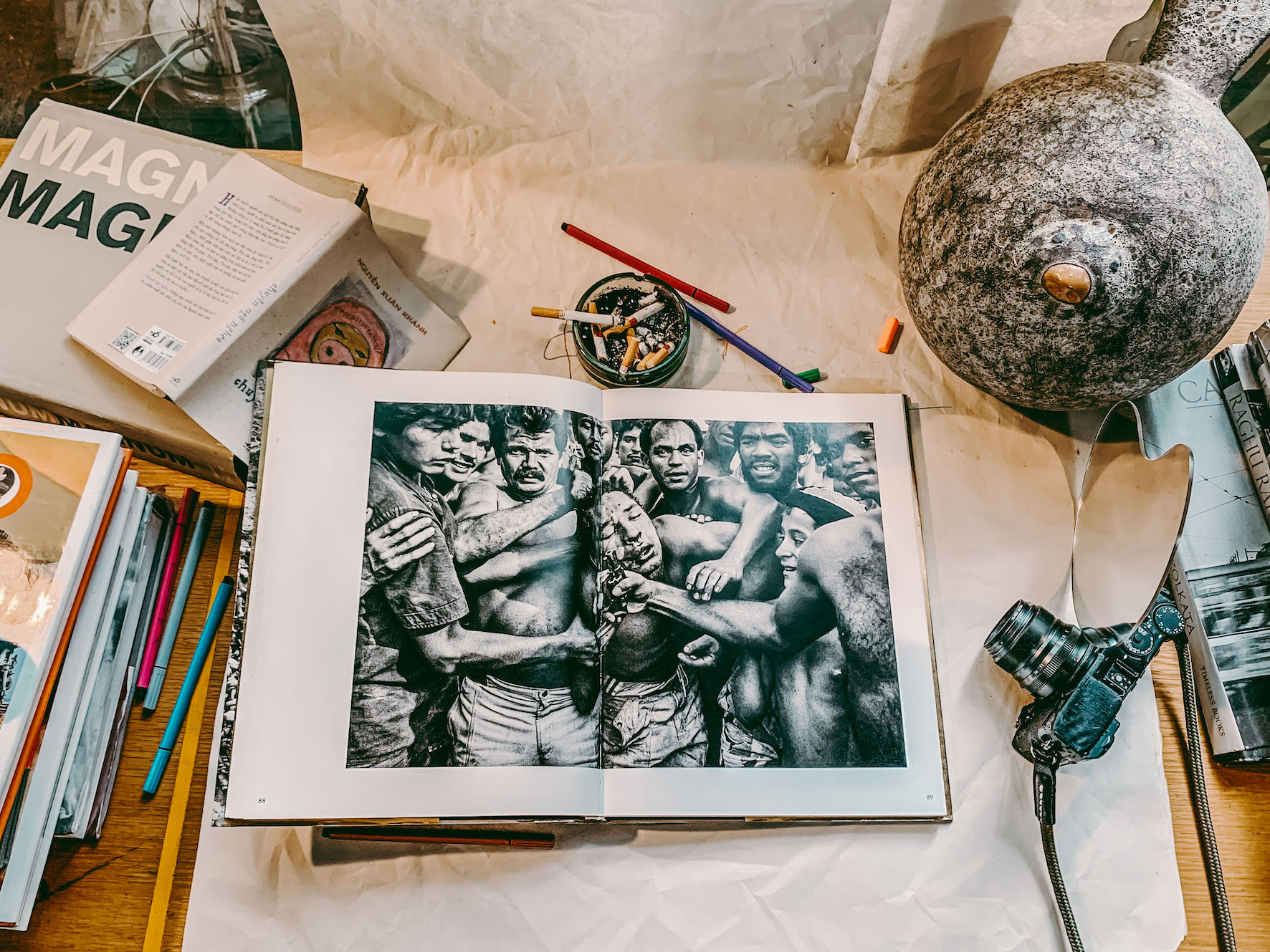 Thực sự, tôi đã bị choáng ngợp khi phải nghĩ về cách thiết kế đồng thời phải chọn những bức ảnh đi kèm có ý nghĩa với thiết kế đó. Vì vậy, tôi đã cố gắng giới hạn bản thân ở mức 10-12 biến thể và lựa chọn ảnh phù hợp với một sơ đồ đã phác thảo. Đó là trò cân bằng giống như trong một vở xiếc, ở đây tôi đặc biệt phải để mắt đến phần đóng gáy nếu tôi muốn đa dạng hoá kích thước của các trang. Gijsbert và tôi đều tin rằng sẽ tốt hơn nếu cuốn sách được sắp xếp theo thứ tự trực quan thay vì theo thứ tự bảng chữ cái hoặc thứ tự thời gian. Anh ấy đã cho tôi tất cả tự do trong việc sắp xếp cuốn sách thành hình…